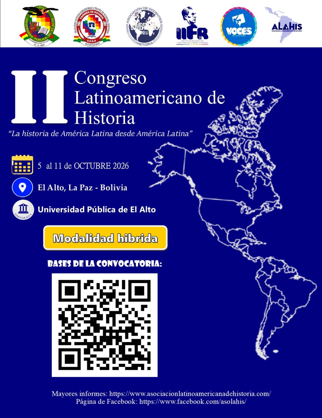 Después del exitoso I Congreso Latinoamericano de Historia desarrollado de manera virtual en 2020. La Asociación Latinoamericana de Historia, El Programa de Licenciatura en Historia de la Universidad Pública de El Alto (Bolivia), El Profesorado de la Licenciatura en Historia, El Centro de Estudiantes del Programa Licenciatura en Historia y con el auspicio de la Decanatura del Área Social de la Universidad Pública de El Alto (UPEA) convocan al II Congreso Latinoamericano de Historia que se desarrollará en la modalidad hibrida (presencial y virtual) del 5 de octubre al 11 de octubre de 2026 en instalaciones de la Universidad Pública de El Alto (La Paz, Bolivia).